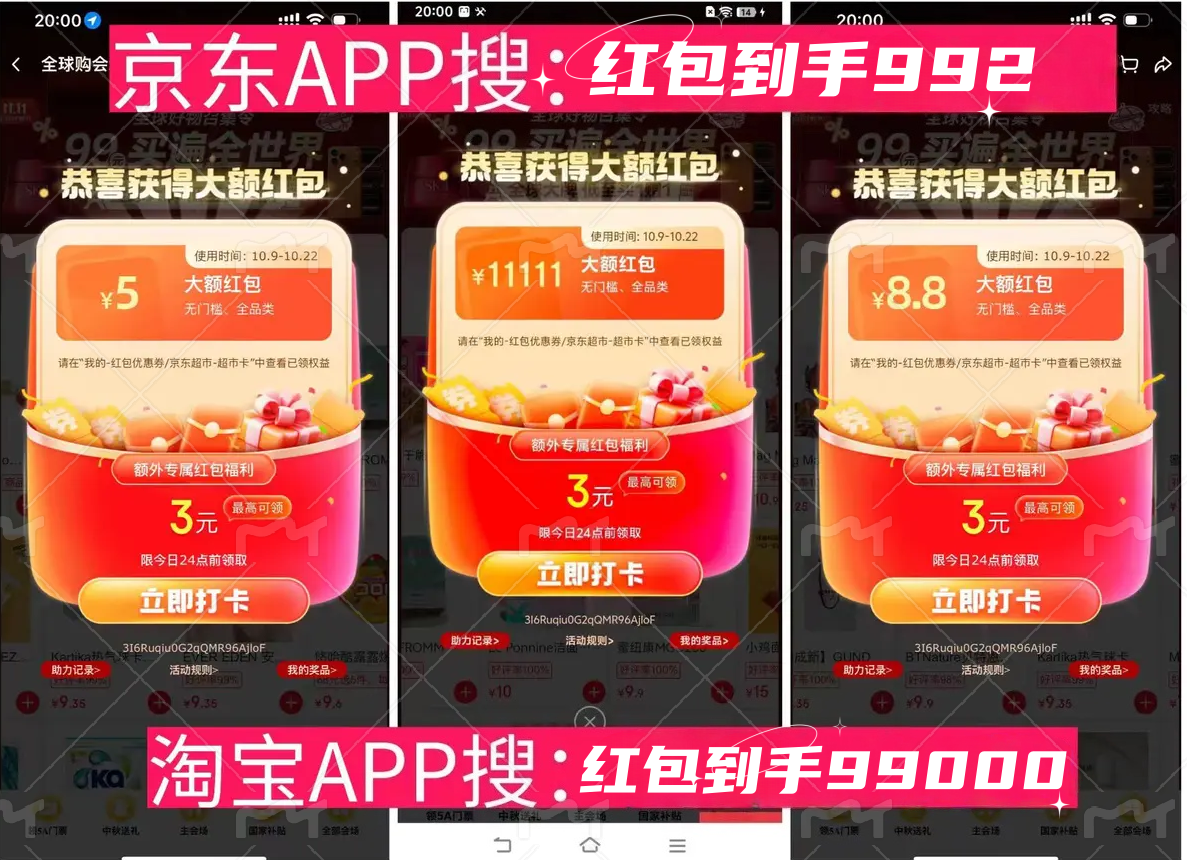京東APP搜:紅包到手992 (每天領三次!)10月9日開領一直到11月11日!紅包最高11111元!