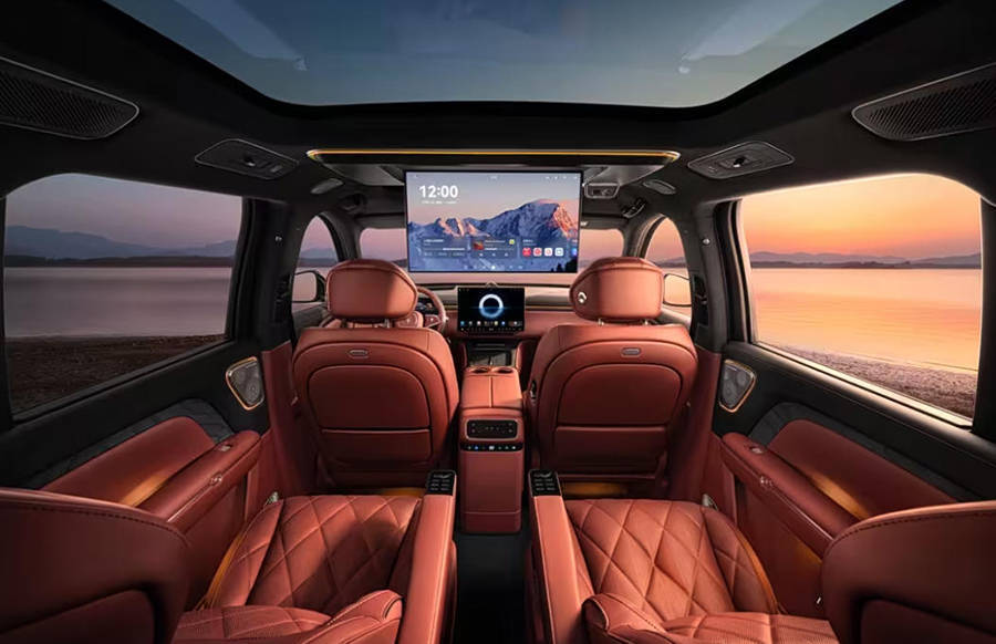 設計層面,嵐圖泰山延續家族式美學語言,前臉采用多條幅鍍鉻中網,中央發光LOGO與貫穿式日行燈形成視覺焦點。分體式大燈組與前格柵融為一體,營造出科技與豪華并存的氣質。車身側面以雙色涂裝搭配半隱藏式門把手,21英寸餅圈輪轂進一步強化精致感。尾部貫穿式尾燈內嵌品牌英文標識,配合車頂擾流板與倒梯形牌照區,層次分明且富有辨識度。新車尺寸達5230/2025/1817mm,軸距3120mm,提供寬敞的乘坐空間。