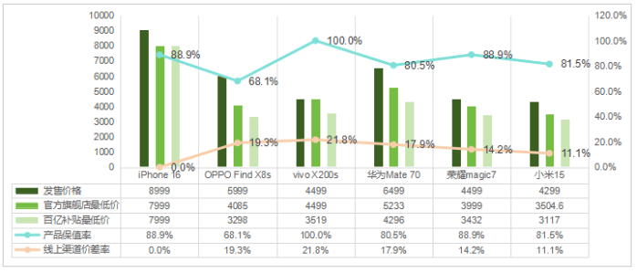 百億補(bǔ)貼渠道的價格競爭更為激烈。拼多多成為8款產(chǎn)品最低價出現(xiàn)最頻繁的平臺,其中vivo X200s與華為Mate 70價差達(dá)1100-1200元,OPPO Find X8s價差約1000元。分平臺表現(xiàn)看,抖音超值購渠道vivo X200s價差達(dá)1000元;京東百億補(bǔ)貼中iPhone 16價差200元;拼多多渠道OPPO Find X8s價差200元;天貓百億補(bǔ)貼中小米15價差300元。值得注意的是,iPhone 17系列未參與任何平臺的補(bǔ)貼活動。