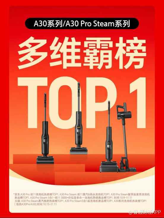 洗地機業務則成為拉動增長的新引擎。雙十一期間,其市場份額達25.02%,凈銷售額同比激增408.52%。旗艦系列A30/A30 Pro Steam在京東、天貓等平臺包攬多個細分品類冠軍,其中A30 Pro Steam因集成160°C蒸汽除菌、25000Pa大吸力、加壓研磨頑固污漬等核心技術,被業界譽為“頂配機皇”。開源證券分析指出,組織架構調整后,石頭科技通過完善價格帶布局、強化產品差異化、拓展銷售渠道及加大品牌投入,成功將掃地機領域積累的品牌勢能與清潔技術復用至洗地機賽道,實現高質量增長。