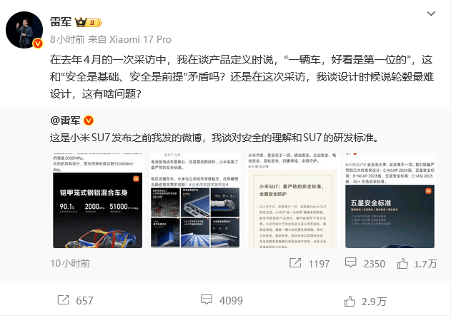 近日,小米汽車因安全話題引發(fā)輿論關(guān)注,小米集團(tuán)創(chuàng)始人雷軍通過社交媒體連續(xù)發(fā)聲,針對外界質(zhì)疑作出詳細(xì)回應(yīng)。此前,部分網(wǎng)友截取雷軍去年四月關(guān)于“一輛車,好看是第一位的”的采訪片段,將其解讀為小米汽車將外觀設(shè)計(jì)置于安全性能之上,引發(fā)爭議。對此,雷軍在11月16日一天內(nèi)發(fā)布三條微博,強(qiáng)調(diào)“安全是基礎(chǔ)、安全是前提”,并指出美觀與安全并非對立關(guān)系。
