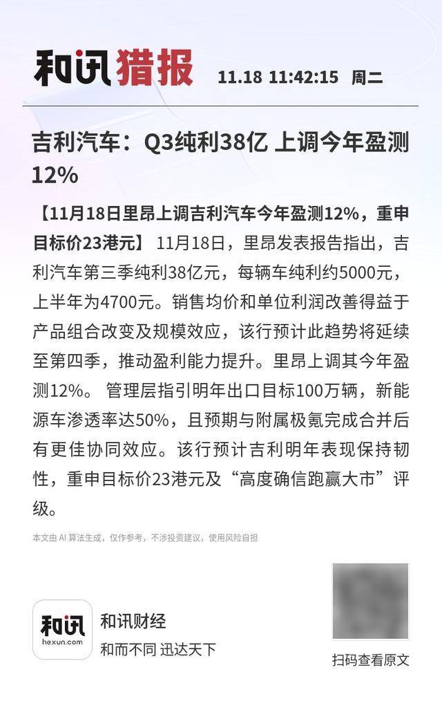 里昂證券最新發(fā)布的行業(yè)研究報(bào)告顯示,吉利汽車在第三季度交出亮眼成績(jī)單,當(dāng)季實(shí)現(xiàn)凈利潤(rùn)38億元人民幣,單臺(tái)車輛凈利潤(rùn)提升至約5000元,較上半年4700元的水平實(shí)現(xiàn)穩(wěn)步增長(zhǎng)。這一業(yè)績(jī)突破主要得益于產(chǎn)品結(jié)構(gòu)優(yōu)化帶來(lái)的銷售均價(jià)提升,以及規(guī)模化生產(chǎn)帶來(lái)的成本優(yōu)勢(shì),研究機(jī)構(gòu)預(yù)計(jì)這種良性發(fā)展態(tài)勢(shì)將持續(xù)至第四季度,進(jìn)一步推動(dòng)企業(yè)盈利能力增強(qiáng)。