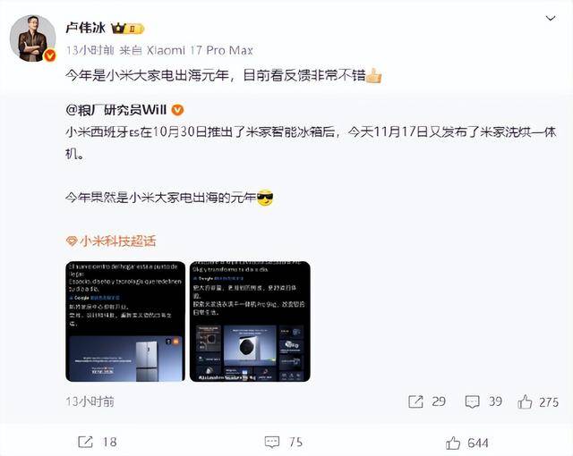 小米大家電出海元年啟航!盧偉冰透露反饋良好 2027年汽車出海計劃提上日程