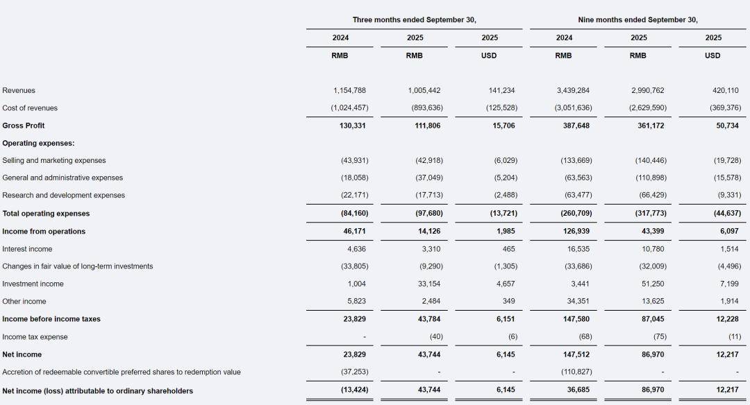 閃送(Nasdaq:FLX)近日公布了其2025年第三季度財務業績,數據顯示公司在營收、利潤和運營效率方面均實現了穩健增長。根據財報,閃送在2025年前九個月實現總營收29.91億元,折合約4.2億美元,毛利達到3.61億元,運營利潤為4340萬元,凈利潤則為8697萬元。