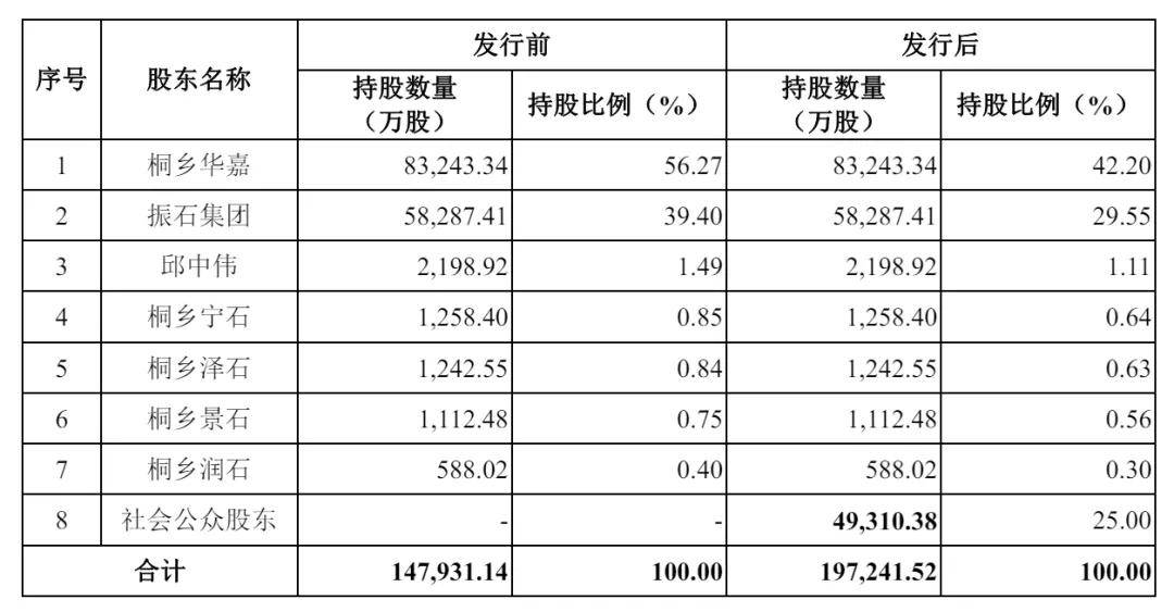 在股權結構方面,公司呈現高度集中特征。發行前,實際控制人張毓強及其子張健侃通過桐鄉華嘉、振石集團等主體合計控制96.51%股份。其他股東包括持股1.49%的邱中偉,以及桐鄉寧石、桐鄉澤石等員工持股平臺。IPO完成后,桐鄉華嘉與振石集團仍將保持控股地位,持股比例分別為42.2%和29.55%,公眾股東持股比例將顯著提升。