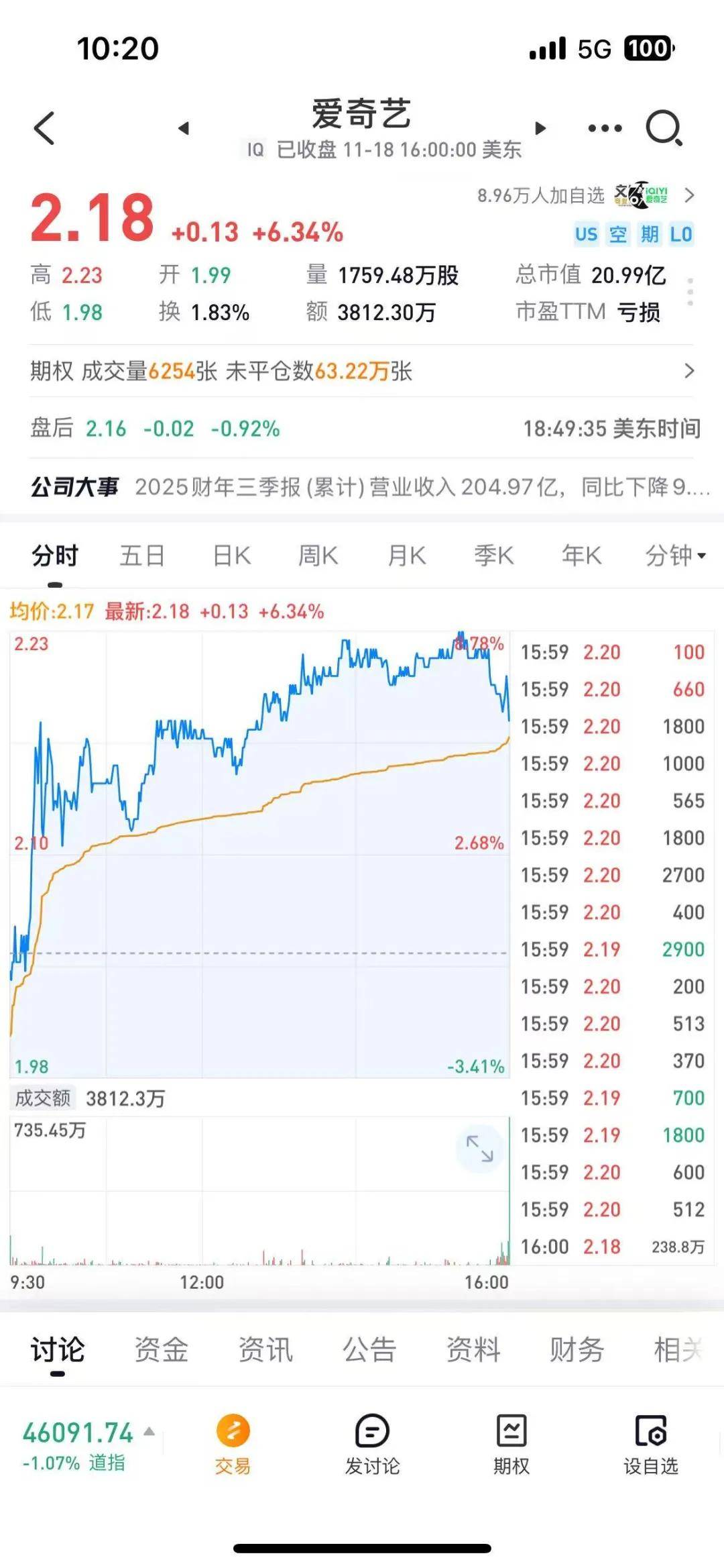 成本方面,愛奇藝第三季度總成本為54.7億元,同比下降3%,其中內容成本為40.4億元。銷售及管理費用為9.3億元,研發費用為4.1億元。在Non-GAAP標準下,公司運營虧損為2190萬元,歸屬于愛奇藝的凈虧損為1.5億元。截至2025年9月30日,公司現金余額(包括現金、現金等價物、短期受限資金、短期投資及預付及其他資產中的長期受限資金)總計48.8億元。當日收盤時,愛奇藝股價上漲超過6%,報收2.18美元,市值達21億美元。