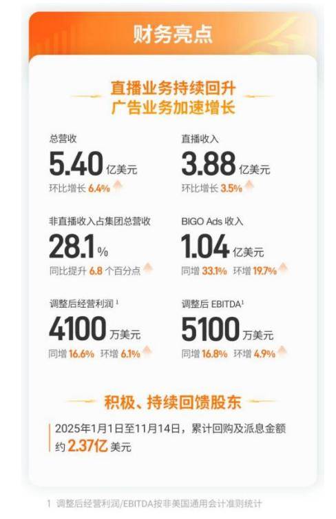 財報顯示,本季度集團總收入達5.4億美元,環比增長6.4%。其中直播業務收入3.88億美元,連續兩個季度實現環比增長,增幅達3.5%。非直播業務收入占比提升至28.1%,主要得益于廣告技術平臺BIGO Ads的強勁表現。該平臺本季度收入達1.04億美元,同比增長33.1%,環比增長19.7%,成為集團增長的重要引擎。