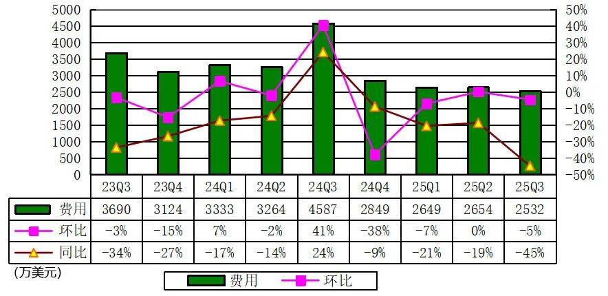 成本與費用方面,公司第三季度成本為1200萬美元,同比增長14.4%;毛利為2330萬美元,同比增長10.8%,毛利率維持在66%的水平。運營費用總額為2530萬美元,較上年同期的4590萬美元大幅下降44.8%。其中,研發費用減少52.8%至1380萬美元,主要因全球員工隊伍優化導致人員成本下降,股權激勵支出從1080萬美元降至70萬美元。銷售及市場營銷費用下降5.6%至650萬美元,一般及行政費用下降48.4%至500萬美元。