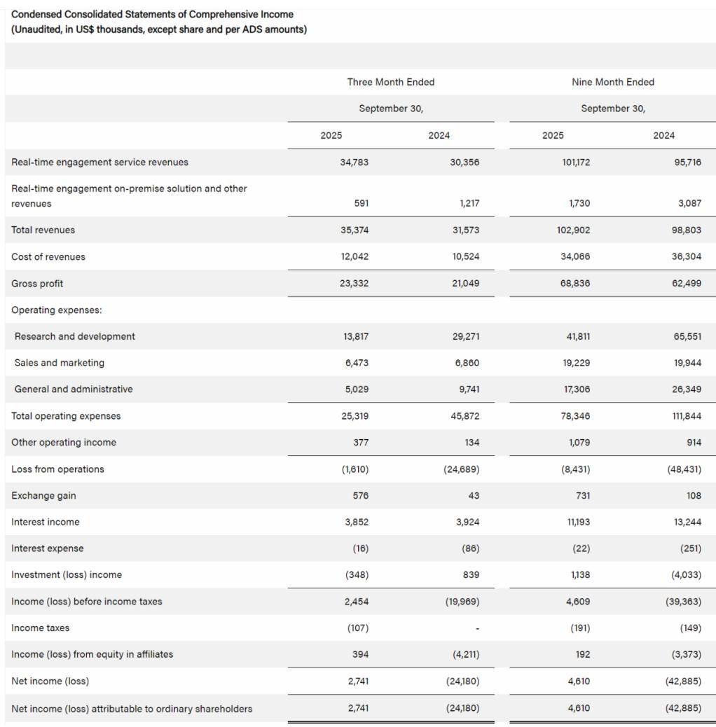 在業務發展方面,Agora, Inc持續加大對話式AI領域的投入。公司創始人兼CEO趙斌表示,核心實時音視頻云業務呈現強勁復蘇態勢,正邁向疫情后首次全年營收增長。與此同時,公司推出對話式AI引擎2.0版本與對話式AI Studio,旨在幫助開發者更輕松地構建高度擬人、交互自然的語音對話智能體。早期客戶反饋積極,隨著應用場景與潛在客戶的持續拓展,預計將成為明年增長的重要動力。