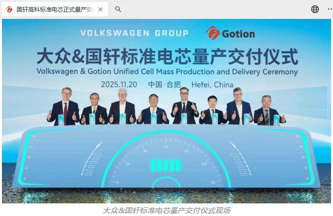 國軒高科與大眾汽車集團的合作迎來里程碑時刻。11月20日,國軒高科在合肥舉辦標準電芯(Unified Cell,簡稱UC)量產(chǎn)交付儀式,標志著雙方與大眾旗下電芯制造商PowerCo歷時五年的戰(zhàn)略合作正式進入規(guī)模化量產(chǎn)階段。根據(jù)協(xié)議,國軒高科將于2026年至2032年間向大眾汽車集團持續(xù)供應高性能磷酸鐵鋰標準電芯及其他類型標準電芯。
