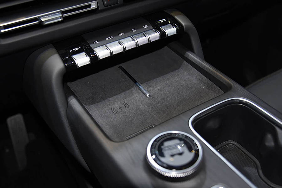 進(jìn)入車內(nèi),iCAR V27的內(nèi)飾設(shè)計在延續(xù)家族風(fēng)格的基礎(chǔ)上,于細(xì)節(jié)處進(jìn)行了創(chuàng)新。車輛配備了懸浮式中控屏,下方依次排列著空調(diào)出風(fēng)口和一排物理按鍵,這種設(shè)計既體現(xiàn)了科技感,又保留了越野車型應(yīng)有的實用屬性。中央扶手區(qū)域布局合理,設(shè)有無線充電面板、駕駛模式旋鈕以及水杯架等,方便駕駛者在行車過程中操作。后排采用三座布局,并配備了空調(diào)出風(fēng)口,為后排乘客提供了舒適的乘坐體驗。