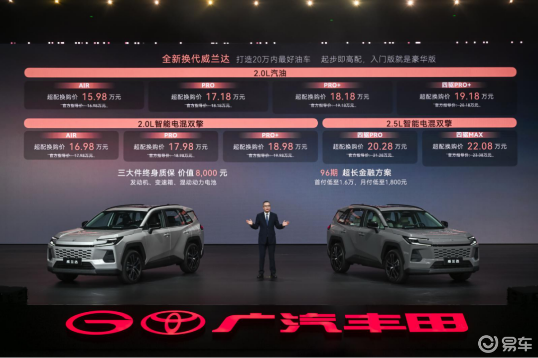 市場策略方面,換代威蘭達采取"高配下放"策略,入門版即配備豪華配置,推出三項超值權益:2.0L汽油版配置升級3萬元后超配價15.98萬元;2.0L混動版升級4萬元后售價16.98萬元;2.5L混動四驅版升級后定價20.28萬元。此舉將中型SUV混動價格首次拉入20萬元區間,配合1萬元置換補貼,形成強大的市場競爭力。