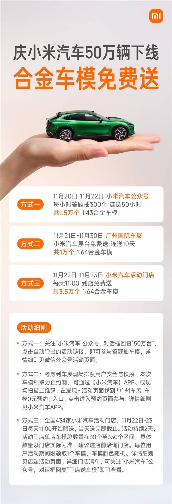 線下方面,2025廣州國際車展成為重要發放陣地。11月22日公眾日開啟后,小米汽車展臺每日限量發放1000個車模,連續10天累計發放1萬個。剩余3.5萬個車模將通過全國小米汽車活動門店免費領取,具體領取規則可咨詢當地門店。