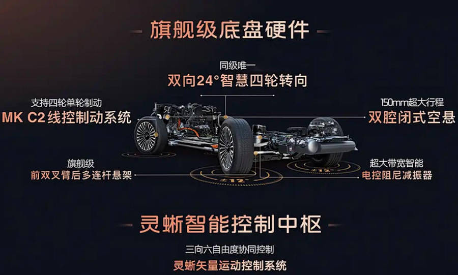 底盤方面,智己LS9搭載的靈蜥數字底盤3.0表現出色。提供雙向24°超大角度智慧四輪轉向系統,配備四輪單輪制動MK C2線控制動系統。支持150mm智能雙腔閉式空懸,配以智能電控阻尼調節系統,前雙叉臂后多連桿懸架的組合,讓車輛行駛更加穩定舒適。全系標配靈蜥矢量四驅系統,并支持靈蜥爆胎穩定控制系統與主動防側翻3.0系統,為行車安全保駕護航。