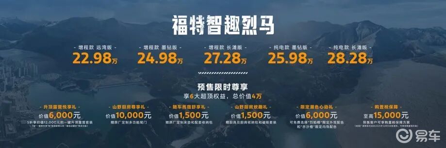 在本屆廣州車展上,全球首款“全地形露營SUV”——福特智趣烈馬得到了眾多媒體和觀眾的關注。該車型增程版提供遠灣、墨鉆、長灘三款配置,預售價分別為22.98萬元、24.98萬元與27.28萬元,CLTC綜合續(xù)航里程達1220公里;純電版包含墨鉆與長灘兩款配置,預售價分別為25.98萬元與28.28萬元,續(xù)航里程達650公里。預售期間,用戶可尊享總價值高達4萬元的6大預售權益。