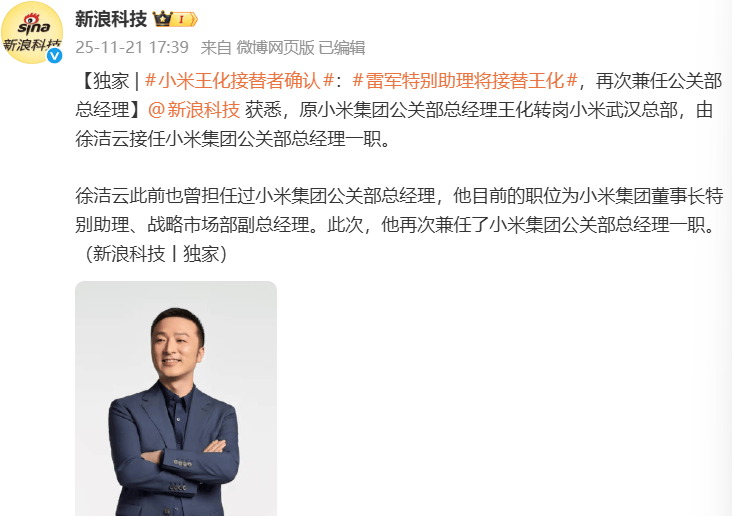 公開資料顯示,徐潔云并非首次擔任該職務。他此前曾主導小米公關工作,目前同時兼任集團董事長特別助理及戰略市場部副總經理。根據內部文件披露,徐潔云將直接向集團副總裁、CMO許斐匯報,形成"戰略-傳播"雙線管理架構。這種安排被解讀為小米加強品牌與市場協同的重要舉措。