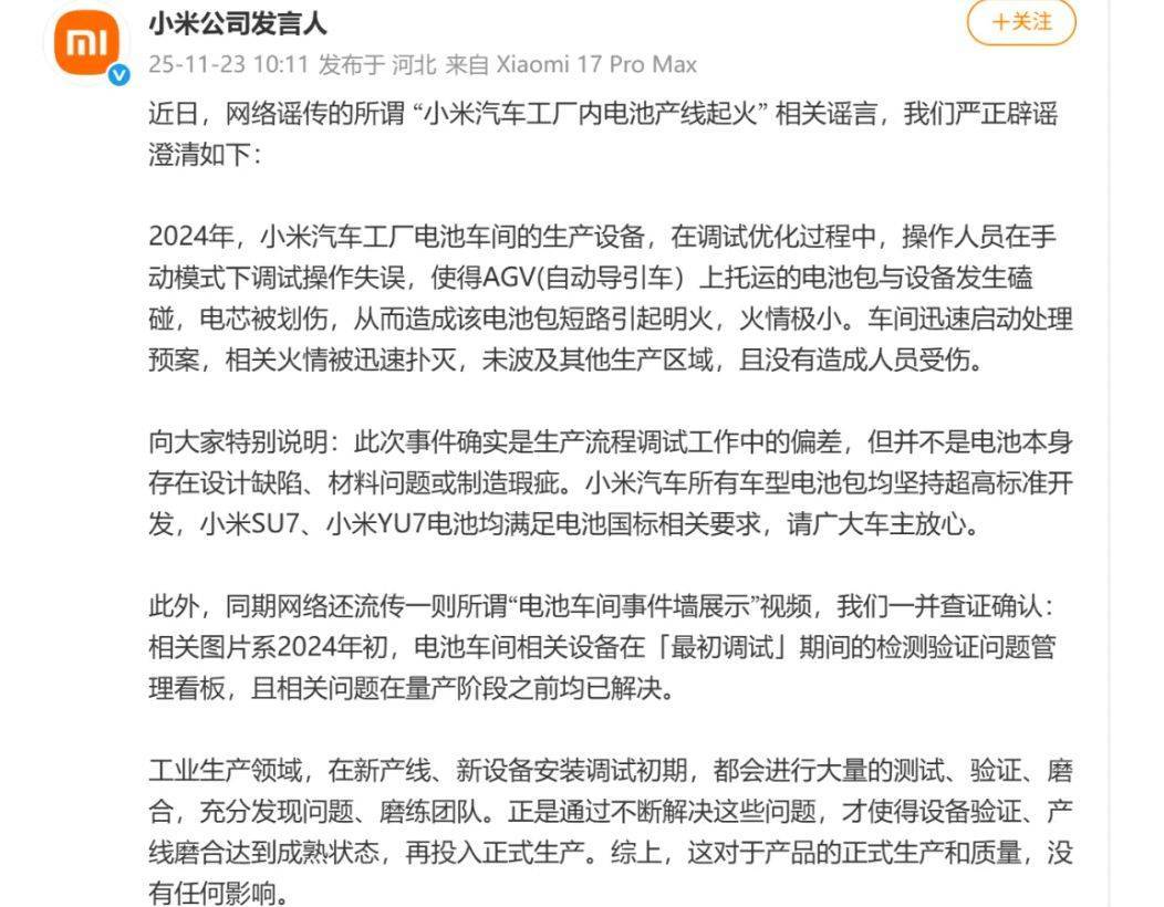 小米方面強調,此次事件屬于生產調試過程中的操作偏差,與電池設計、材料或制造工藝無關。所有車型電池均通過國家標準認證,包括已上市的小米SU7和即將發布的小米YU7。針對同期流傳的“電池車間事件墻展示”視頻,公司澄清相關圖片為2024年初設備初期調試階段的檢測管理看板,所有問題已在量產前解決。