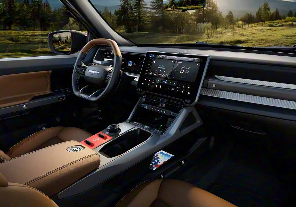 內飾空間布局遵循功能至上原則,橫平豎直的線條勾勒出硬朗的座艙輪廓。耐磨材質覆蓋的中控臺和座椅表面,可有效抵御泥沙侵蝕,方便用戶清潔維護。12.3英寸全液晶儀表盤與14.5英寸中控觸控屏構成數字化交互核心,同時保留了空調控制等關鍵物理按鍵,確保在顛簸路況下的操作可靠性。這種傳統與現代的融合設計,既保留了越野車的實用特質,又注入了智能科技元素。