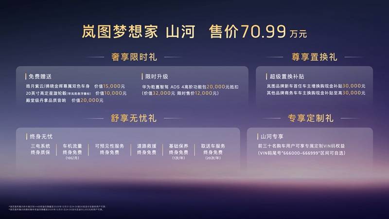 在廣州車展的璀璨舞臺上,一款名為嵐圖夢想家山河的“新時代旗艦四座MPV”正式揭開神秘面紗,以70.99萬元的售價震撼登場,同步推出的山河專屬四重禮更是誠意滿滿,涵蓋皓月紫云/拂曉金輝尊屬雙色車身、20英寸高定星漩輪轂(帶嵐圖懸浮徽標)、殿堂級丹拿品質音響等,還有華為乾崑智駕ADS 4高階功能包現金抵扣、超級置換補貼、專屬定制VIN碼權益,以及三電系統終身質保、車機流量終身免費、道路救援終身免費等貼心服務,瞬間成為全場焦點。