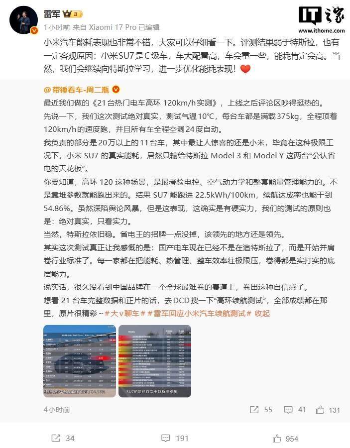 針對(duì)近期外界關(guān)注的小米SU7能耗評(píng)測(cè)結(jié)果弱于特斯拉的討論,雷軍通過(guò)微博作出回應(yīng)。他指出,小米SU7作為一款C級(jí)車,車身尺寸較大且配置豐富,導(dǎo)致整車重量較高,因此能耗表現(xiàn)相對(duì)較高屬于客觀因素。同時(shí),他強(qiáng)調(diào)小米汽車始終將優(yōu)化能耗作為重要目標(biāo),未來(lái)將繼續(xù)向特斯拉等行業(yè)標(biāo)桿學(xué)習(xí),通過(guò)技術(shù)創(chuàng)新與工藝改進(jìn),持續(xù)提升產(chǎn)品的能效水平。