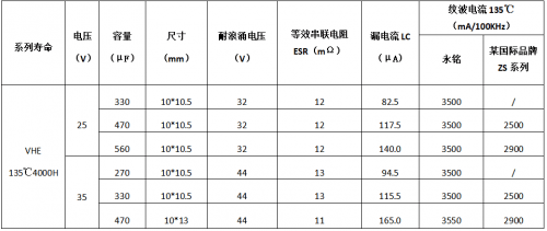 通過35V 330μF 10*10.5規格產品的對比測試,VHE系列在耐壓、ESR、漏電流密度等關鍵參數上均優于前代。其獨特的耐過載設計可承受突發沖擊工況,卓越的充放電循環性能使其在頻繁啟停場景下壽命延長50%以上。這些特性使其成為電子水泵/油泵控制器、冷卻風扇驅動電路等高溫應用場景的理想選擇。