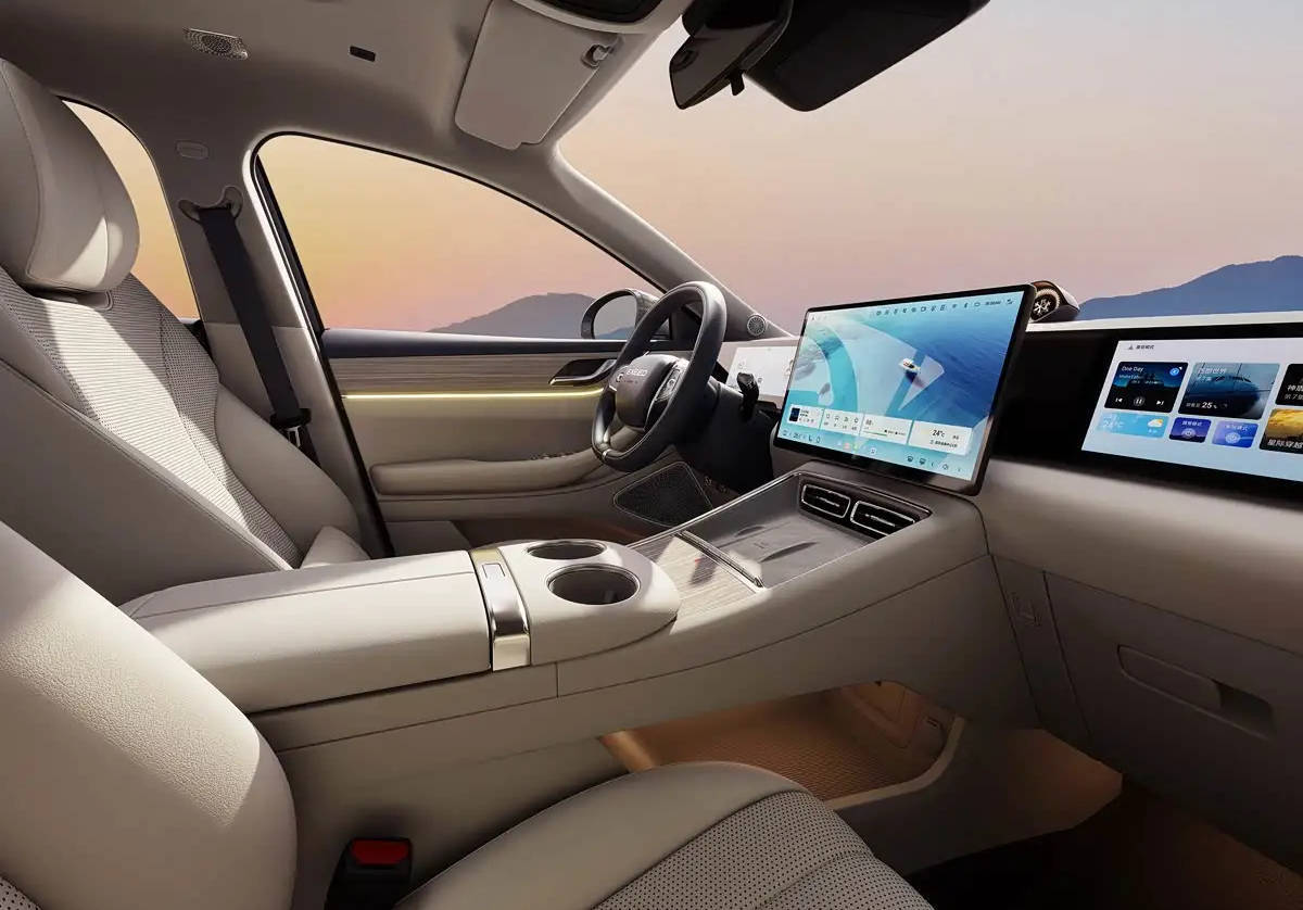 內(nèi)飾設(shè)計(jì)以中軸對稱的三聯(lián)屏為核心,科技感與實(shí)用性并存。中控臺(tái)下方依次布局空調(diào)出風(fēng)口、無線充電面板及杯架,扶手箱采用鍍鉻飾條點(diǎn)綴,上方物理鐘表則增添了一絲復(fù)古韻味。門板與中控臺(tái)下方均配備氛圍燈,整體風(fēng)格簡約而不失高級(jí)感。