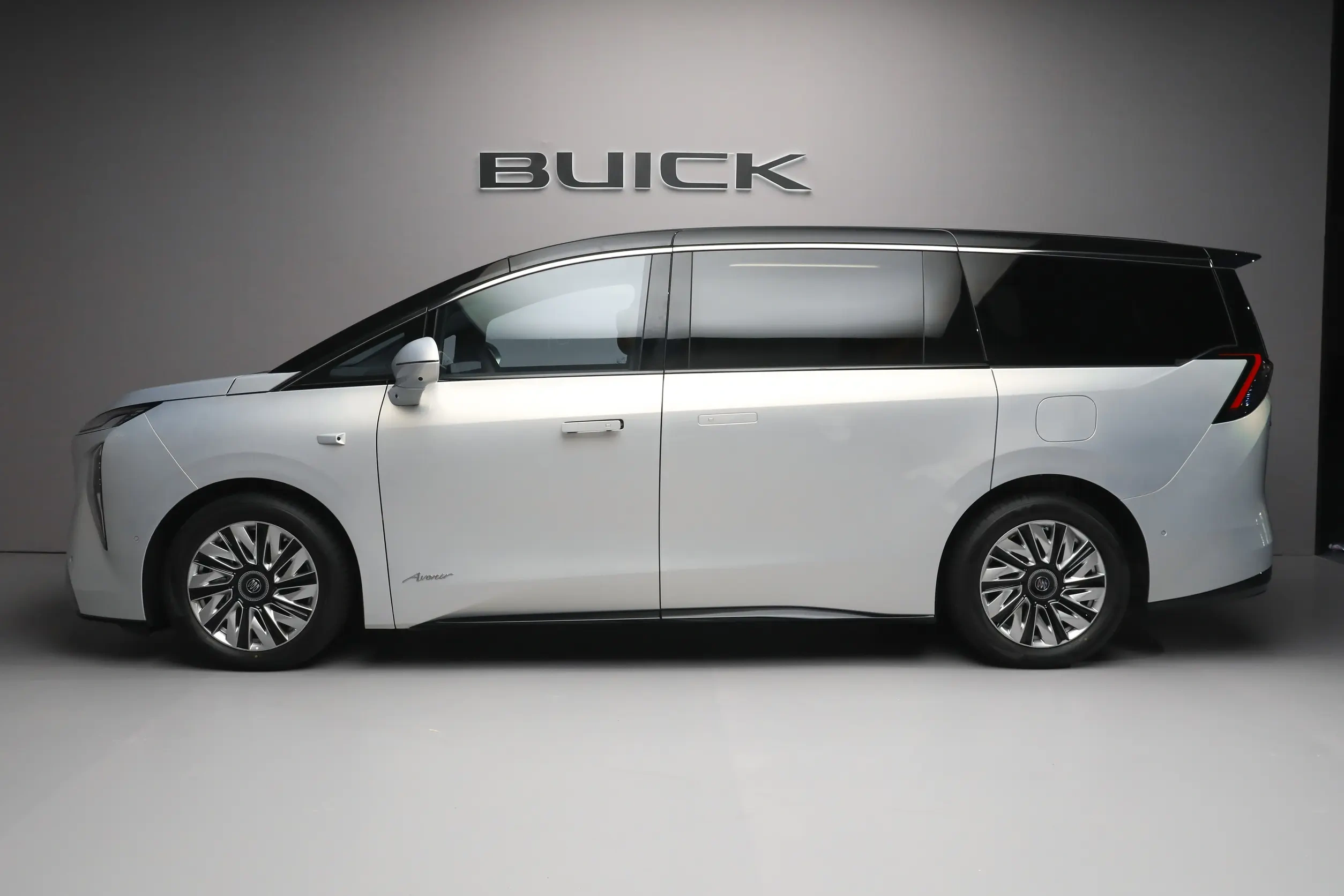 車身側面輪廓高大挺拔,雙色車身設計搭配熏黑車窗與車頂,營造出懸浮式車頂的輕盈感。貫穿車身的鍍鉻窗線與隱藏式門把手進一步提升了精致度,而柔順的腰線設計則有效降低了風阻系數。新車尺寸達到5260/2023(2000)/1820(1835)mm,軸距3160mm,全面超越別克世紀,為車內空間奠定基礎。車尾部分,貫穿式尾燈組采用中間細長、兩端加粗的設計,點亮后呈現羽翼狀光效,與頂部擾流板中的高位剎車燈形成呼應,強化了立體層次感。