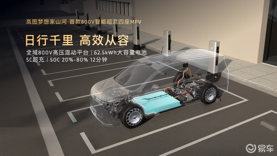 作為全球首款搭載800V智能超混技術(shù)的四座MPV,嵐圖夢(mèng)想家山河在性能方面也表現(xiàn)卓越。其跨代領(lǐng)先的三電技術(shù),實(shí)現(xiàn)了高效補(bǔ)能與從容續(xù)航的完美結(jié)合。配備的62.5度大容量電池,融合5C超充技術(shù),支持全溫域快充,從20%至80%電量補(bǔ)充僅需12分鐘。無(wú)論是城市接待還是跨城通勤,都能輕松勝任,讓四座MPV擁有“日行千里”的高效出行體驗(yàn)。