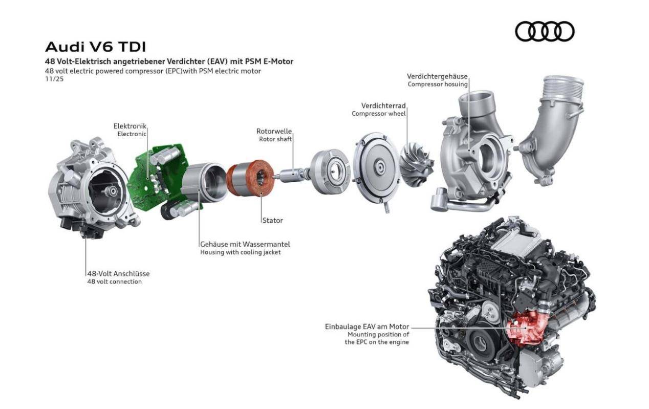新款柴油發(fā)動(dòng)機(jī)的另一大亮點(diǎn)是其近乎零渦輪遲滯的表現(xiàn)。奧迪新款柴油機(jī)的加速線性程度接近大排量自吸發(fā)動(dòng)機(jī),這得益于三大技術(shù):電動(dòng)增壓器、48V輕混系統(tǒng)以及升級(jí)的廢氣渦輪。其中,電動(dòng)增壓器是消除遲滯的關(guān)鍵。在低轉(zhuǎn)速時(shí),廢氣能量不足,傳統(tǒng)渦輪難以啟動(dòng),而電動(dòng)增壓器通過(guò)電機(jī)驅(qū)動(dòng)壓氣葉輪,無(wú)需依賴廢氣即可立即增壓。它能在250毫秒內(nèi)將轉(zhuǎn)速提升至90000轉(zhuǎn)/分鐘,比上一代增加了40%,使得發(fā)動(dòng)機(jī)在1500轉(zhuǎn)/分鐘時(shí)即可爆發(fā)580牛·米的扭矩,輸出堪比電機(jī)。