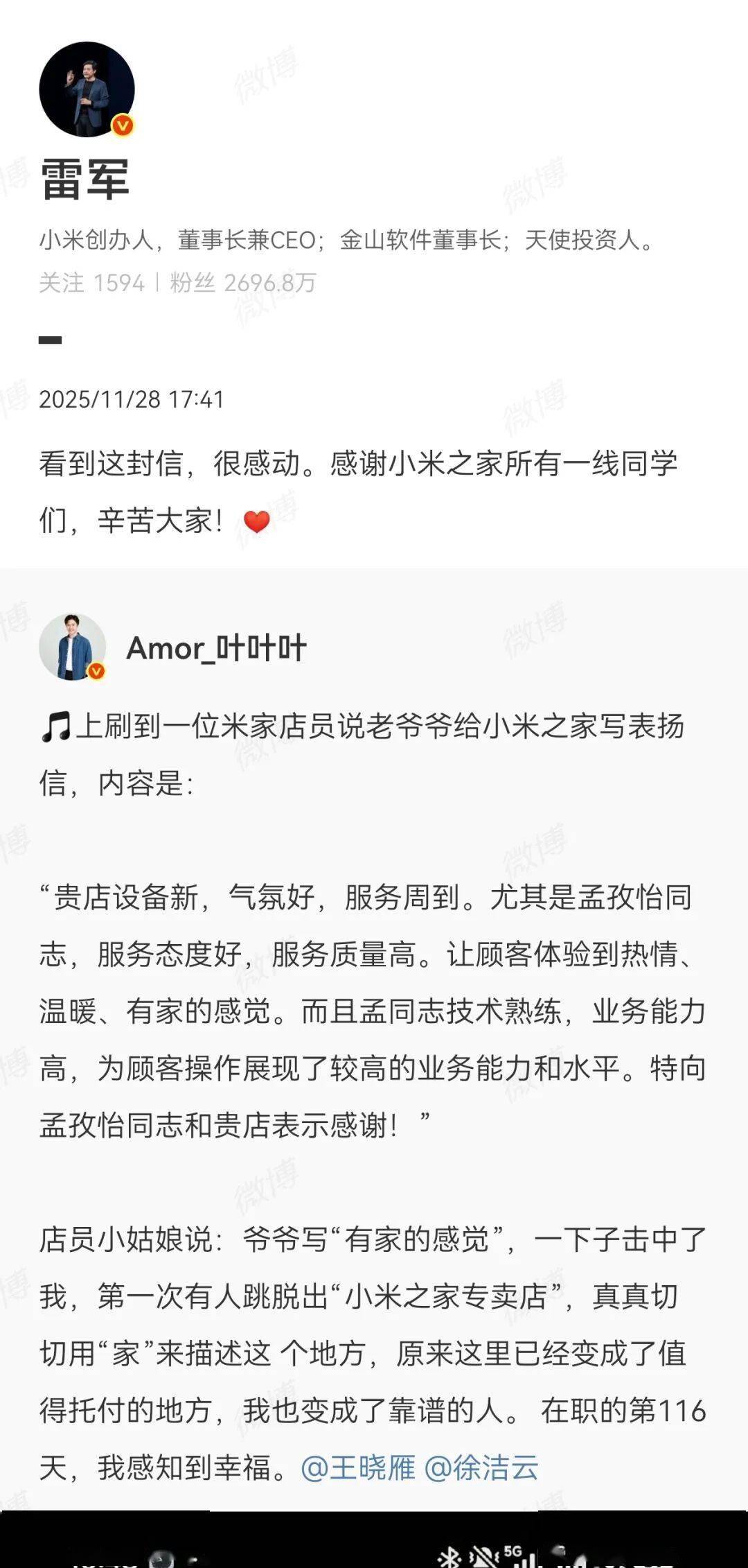 這封充滿溫度的信件很快被小米集團(tuán)董事長(zhǎng)雷軍轉(zhuǎn)發(fā)至個(gè)人微博。雷軍表示,一線員工的真誠(chéng)付出是品牌最珍貴的財(cái)富,正是這些看似平凡的細(xì)節(jié),構(gòu)筑起用戶對(duì)品牌的信任。數(shù)據(jù)顯示,截至2025年9月,小米之家全國(guó)門店總數(shù)已突破1.8萬家,其中500平方米以上的大型體驗(yàn)店達(dá)210家,海外門店數(shù)量同步增長(zhǎng)至300家,形成覆蓋城鄉(xiāng)的立體化服務(wù)網(wǎng)絡(luò)。