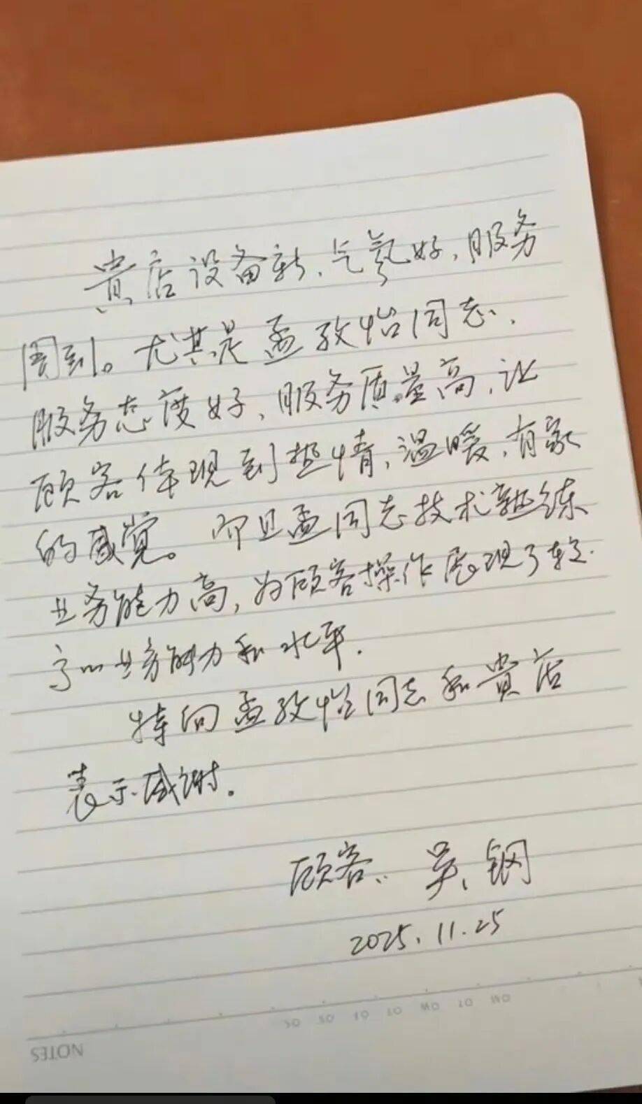 據(jù)涉事門店工作人員回憶,老人當(dāng)日進(jìn)店后不僅咨詢手機(jī)使用問題,還對(duì)智能家電、穿戴設(shè)備等生態(tài)產(chǎn)品表現(xiàn)出濃厚興趣。孟孜怡在完成基礎(chǔ)服務(wù)后,主動(dòng)為老人演示了設(shè)備間的互聯(lián)場(chǎng)景,這種超出預(yù)期的服務(wù)體驗(yàn)讓老人當(dāng)場(chǎng)寫下"有家的感覺"的感言。該員工在社交平臺(tái)分享感受時(shí)寫道:"當(dāng)聽到顧客用'家'形容門店時(shí),突然意識(shí)到我們的工作正在創(chuàng)造超越商業(yè)的價(jià)值。"