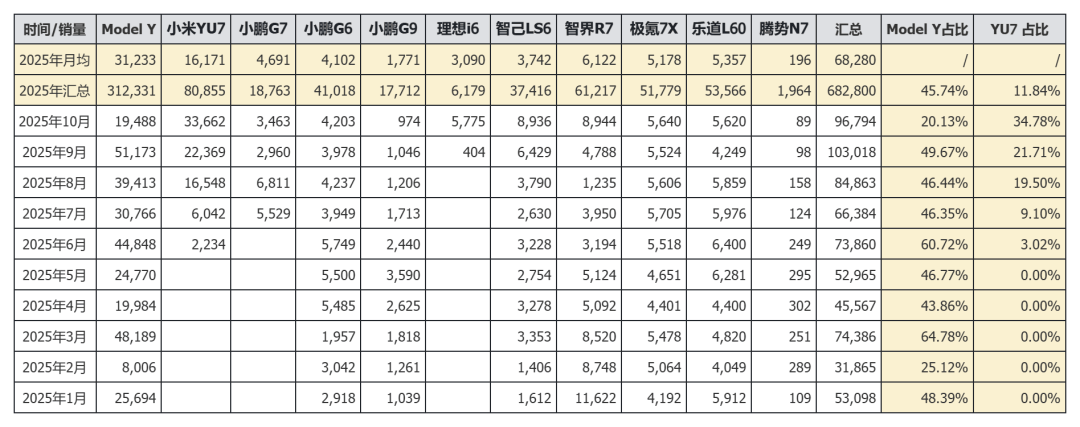 在細分市場層面,15-30萬元純電SUV領域呈現明顯分層:15萬元級主打性價比,如比亞迪海獅06;20萬元級聚集了極氪7X、樂道L60等“守門員”產品;25萬元級則由Model Y長期占據主導地位。小米YU7精準切入這一區間,通過“更大空間、更高配置、相近價格”的策略直接挑戰Model Y。數據顯示,YU7上市后迅速搶占該細分市場近三分之一份額,且份額呈持續擴大趨勢,對Model Y形成實質性沖擊。