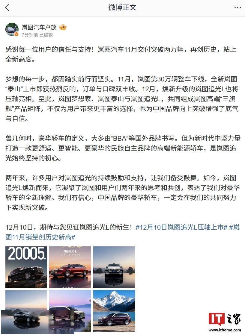 嵐圖汽車近日迎來重要里程碑,其董事長兼總經(jīng)理盧放正式對外宣布,品牌11月交付量成功突破兩萬輛大關,刷新歷史紀錄,標志著發(fā)展進入全新階段。這一成績不僅體現(xiàn)了市場對嵐圖產(chǎn)品的高度認可,也為其沖刺年度目標注入強勁動力。