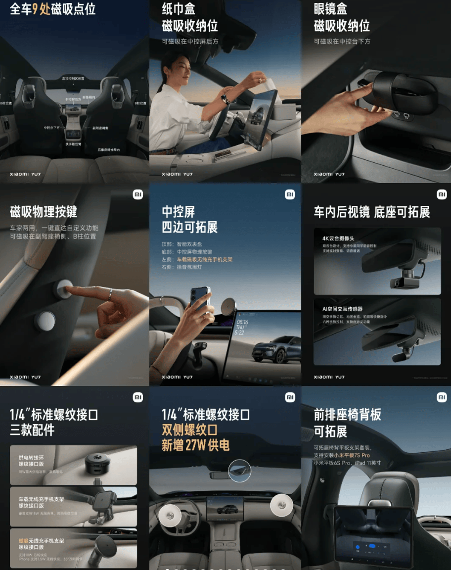 家庭出行與收納痛點的解決,更能體現產品的“生活溫度”。電動車前備箱的普及,不僅拓展了儲物空間,還更加方便置物和取物,擁有更大前備箱的樂道L90、蔚來ES8等車型因此備受好評。車內的儲物設計同樣重要,銀河E5、星愿與智界R7在第二排座椅下方設置抽屜式儲物盒,將空間利用做到極致,毛毯、拖鞋、紙巾等物品能被整齊收納。小米YU7的中控扶手箱設計也堪稱巧思,下方超大開放式儲物空間,既能放下女士的背包,也能輕松容納一雙高/平底跟鞋,還可搭配可拆分的置物架實現分區收納,精準擊中了用戶的收納焦慮。