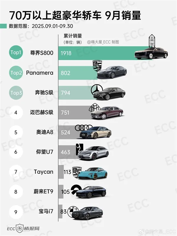 根據多家科技和汽車博主的銷量統計,在9月份,尊界S800賣了接近2000輛車,這個成績讓它在這個頂級細分市場里排到了第一。