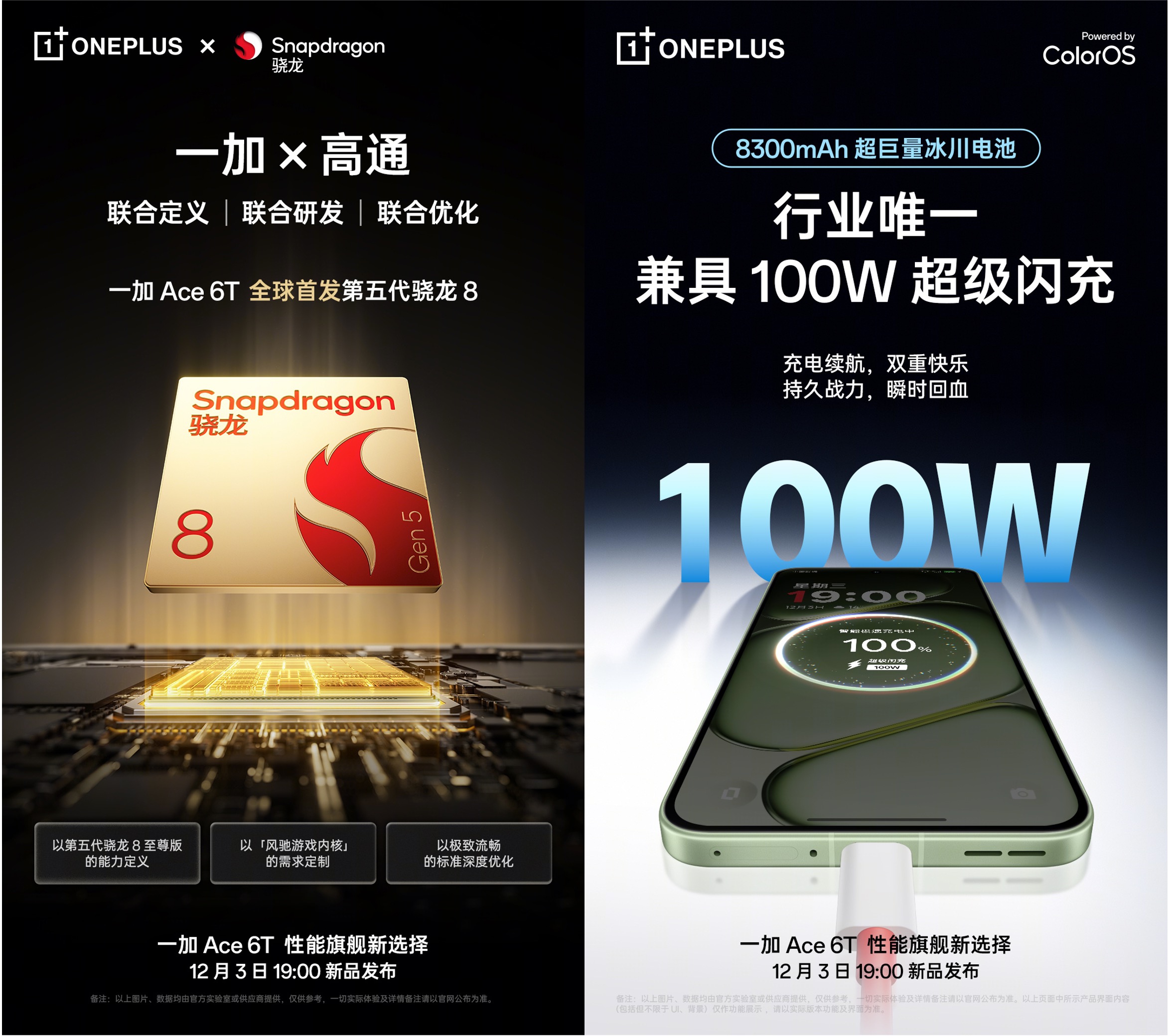 核心配置上,一加 Ace 6T原神神里綾華定制機與一加 Ace 6T擁有同樣全面旗艦的硬核配置。一加 Ace 6T全球首發搭載第五代驍龍8移動平臺,配合寫入芯片底層的自研「風馳游戲內核」與全面升級的「冰河散熱系統」,性能位列行業第一梯隊,是同檔唯一支持原生165 高幀游戲的性能旗艦。續航方面,一加 Ace 6T配備8300mAh超巨量冰川電池加100W超級閃充,全面保障了游戲與日常使用的續航需求,是行業唯一同時兼具8300mAh電池和百瓦閃充的手機,實力出眾。一加 Ace 6T還配備165Hz超高刷電競屏,搭載5000萬像素索尼超光影主攝以及全新ColorOS 16系統,支持IP66/68/69/69K滿級防塵防水,配置全面,誠意十足。目前一加 Ace 6T已全面開啟新品預約,參與活動可解鎖專屬好禮。