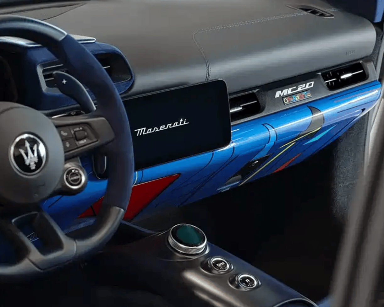 內飾部分,MC20“Opera d’Arte”敞篷特別版延續了Fuoriserie私享定制項目的核心理念,將內飾打造成“個性表達的畫布”。激光雕刻的Alcantara面料與碳纖維運動飾件相結合,營造出兼具張力與細膩的感官體驗。儀表臺下緣的手繪細節與上方皮革包覆和諧交融,讓駕乘者仿佛置身于一件藝術孤品之中。這種匠心獨運的設計不僅體現在內飾材質上,更通過色彩與紋理的搭配,傳遞出獨特的藝術氛圍。