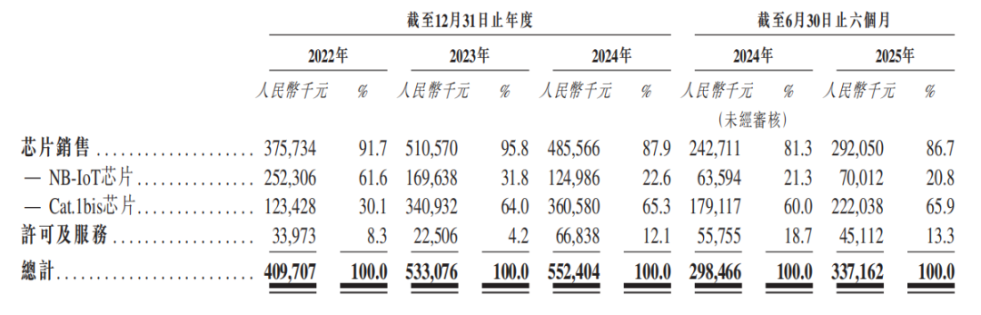 招股書顯示,移芯通信構建了覆蓋低、中、高速無線傳輸領域的完整芯片產品矩陣,其核心優勢在于通過“PPA(功耗、性能、面積/成本)”平衡技術,使智能表計、車載設備及工業終端等物理實體實現高效數據交互。公司芯片產品已形成三大技術路線:NB-IoT芯片占比20.8%,Cat.1bis芯片占比65.9%,其他蜂窩通信芯片占比13.3%,2025年上半年芯片銷售收入占總營收的86.7%。