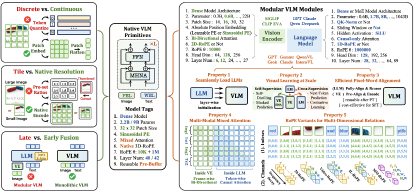 與傳統(tǒng)模塊化設(shè)計不同,NEO 架構(gòu)從底層原理出發(fā),采用原生多模態(tài)設(shè)計理念,通過核心架構(gòu)層面的深度融合,實現(xiàn)了性能、效率與通用性的全面提升。研發(fā)團隊在注意力機制、位置編碼和語義映射三個關(guān)鍵維度進行底層創(chuàng)新,使模型能夠統(tǒng)一處理視覺與語言信息,突破了單一模態(tài)的局限性。