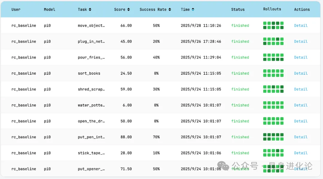 “具身進化論”從進度分情況看到,模型雖然在部分任務中能完成初段動作,但多數情況下未能完成關鍵步驟,執行鏈條往往在中段被迫中斷。這與平臺強調的“多階段連續操作能力”形成明顯差距。