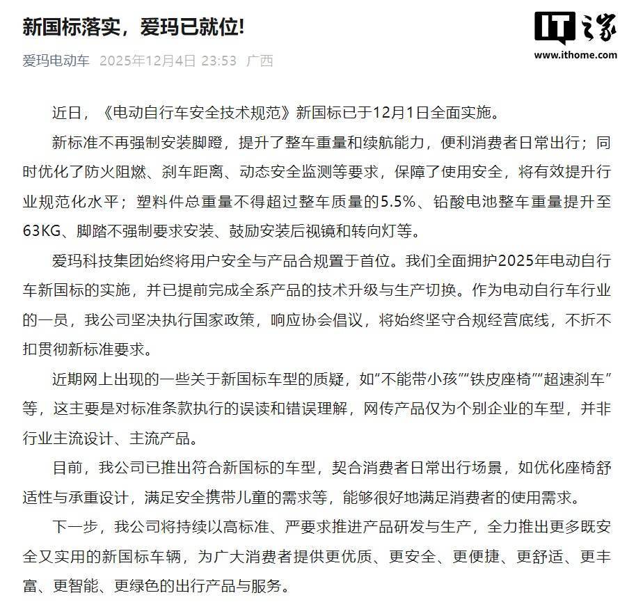 《電動(dòng)自行車(chē)安全技術(shù)規(guī)范》新國(guó)標(biāo)自12月1日起正式落地實(shí)施,引發(fā)社會(huì)廣泛關(guān)注。針對(duì)近期網(wǎng)絡(luò)流傳的“新國(guó)標(biāo)車(chē)型無(wú)法載人”“座椅材質(zhì)爭(zhēng)議”“剎車(chē)性能質(zhì)疑”等聲音,愛(ài)瑪科技集團(tuán)發(fā)布官方聲明,澄清相關(guān)質(zhì)疑系對(duì)標(biāo)準(zhǔn)條款的片面解讀,并強(qiáng)調(diào)網(wǎng)傳爭(zhēng)議車(chē)型僅為個(gè)別企業(yè)設(shè)計(jì),不代表行業(yè)主流方向。