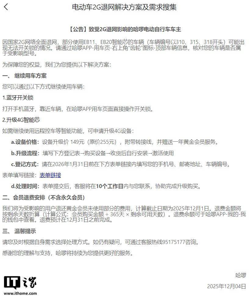 第一種方案是繼續使用現有車輛。用戶可選擇藍牙近場操作模式,只需開啟手機藍牙功能并靠近車輛,即可在App用車頁面直接完成開關鎖。若需保留遠程控車等智能功能,可申請升級4G智能設備。升級套餐包含優惠價149元的4G設備(原價255元)、專用轉接線及一年黃金會員服務。用戶需在2026年1月31日前通過指定表單登記信息,提交后10個工作日內將有客服協助完成購買流程,設備到貨后可自行安裝激活。