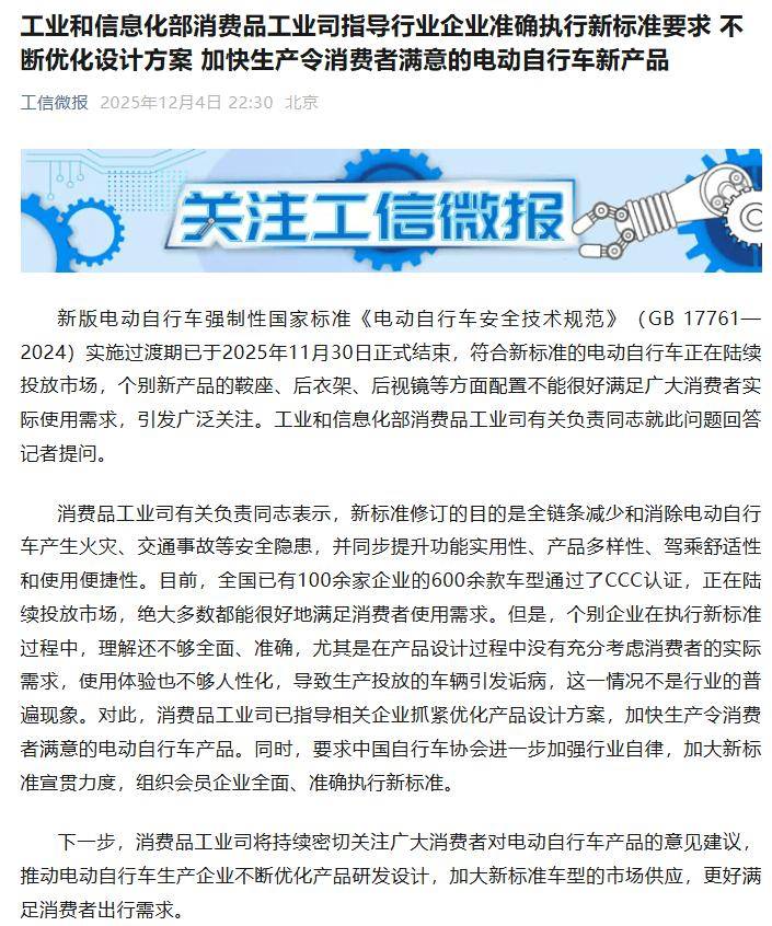 近日,工業和信息化部消費品工業司針對新版電動自行車強制性國家標準實施后出現的問題作出回應。新版《電動自行車安全技術規范》(GB 17761—2024)已于2025年11月30日結束過渡期,符合新標準的車型正逐步進入市場。然而,部分消費者反映,個別新車型在鞍座、后衣架、后視鏡等配置上未能充分滿足實際使用需求,引發社會關注。
