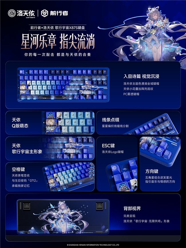 整體采用洛天依藍色調,從淺藍的鍵帽底色到深藍的邊框線條,漸變過渡如同清晨的天空與深夜的銀河;PC高透鍵帽下,RGB動態光效緩緩流動,每一次按鍵都仿佛觸發一顆星辰的閃爍,完美呼應“歌行宇宙”的創意脈絡。
