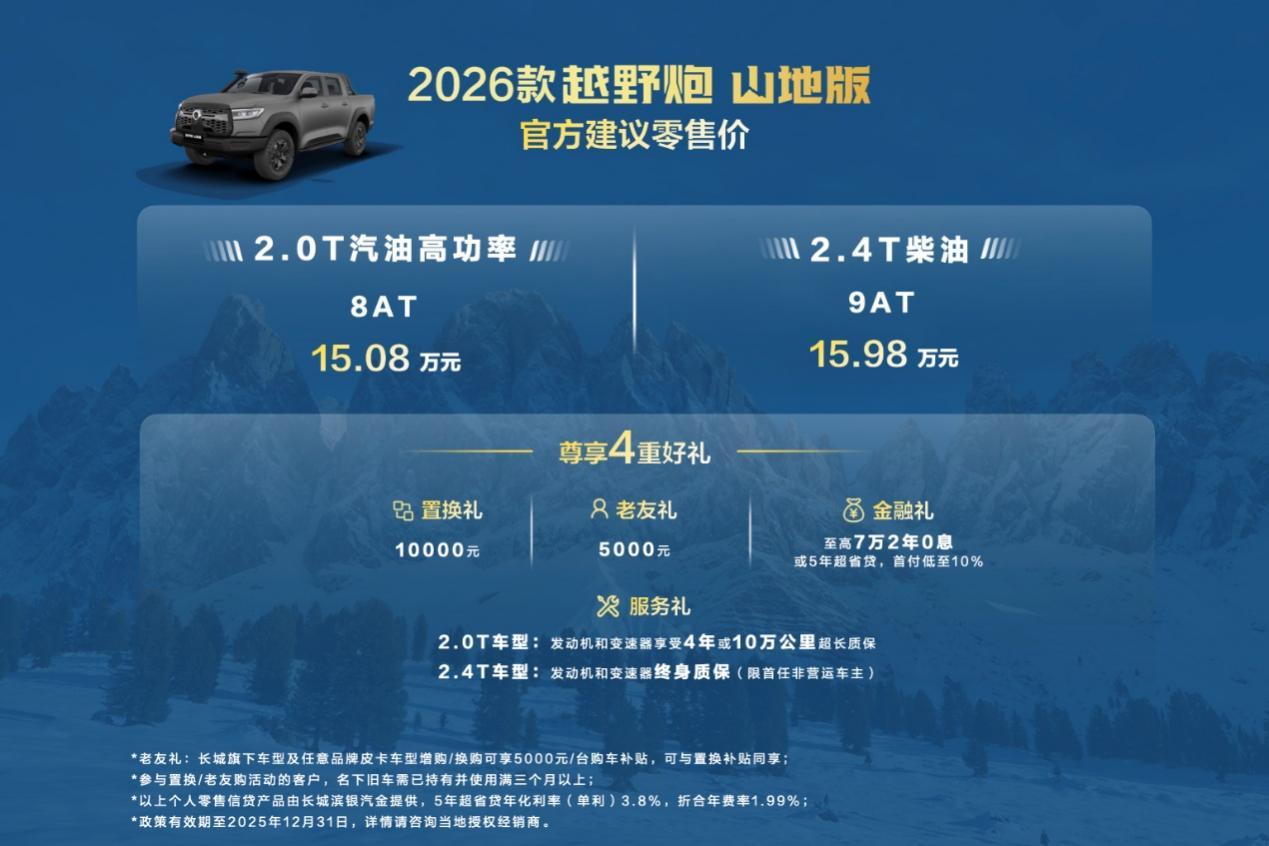 長城炮山地版此次推出商用炮與越野炮兩大系列,共四款車型。商用炮山地版定價12.38萬至14.08萬元,越野炮山地版定價15.08萬至15.98萬元,購車用戶可享四重專屬禮遇。這款車型的研發(fā)直擊西南用戶核心需求:既要能承載重托穿梭工地,又要能征服未知的山野,成為創(chuàng)業(yè)者與生活探險者的可靠伙伴。