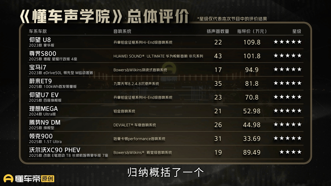 測試體系采用“客觀數據+主觀體驗”雙軌制,所有車輛均為懂車帝從全國4S店隨機采購或租賃的量產版本,確保測試條件與消費者實際用車場景完全一致。測試團隊通過專業設備采集振動噪聲數據,同時組建由十余位音樂人、聲學工程師構成的盲聽評審團,從音色還原度、空間感等維度進行主觀評分,最終形成1-5星的綜合評級。