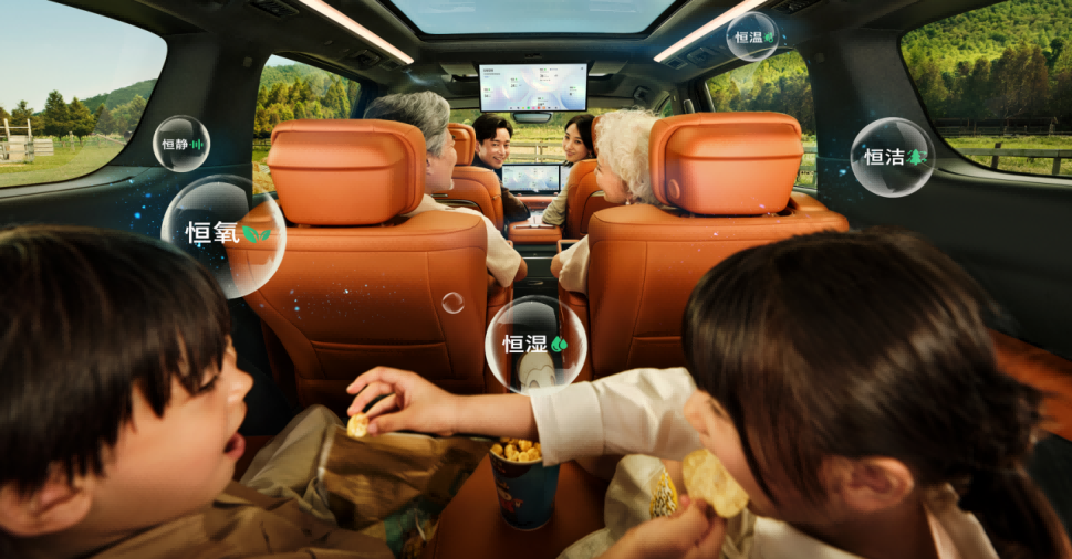 針對高凈值家庭對健康出行的需求,至境世家首創“五恒”大健康座艙,通過恒溫、恒濕、恒氧、恒潔、恒靜技術,打造安全舒適的移動空間。座艙搭載松下nanoe?X凈化系統與南德TüV護眼認證的1.1米智慧頂燈,座椅皮革通過OEKO-TEX嬰兒級認證,電磁輻射值低于手機,為備孕夫婦、嬰幼兒及敏感人群提供全方位健康保障。這一創新配置,標志著新能源MPV從“功能堆砌”向“健康價值”的跨越。