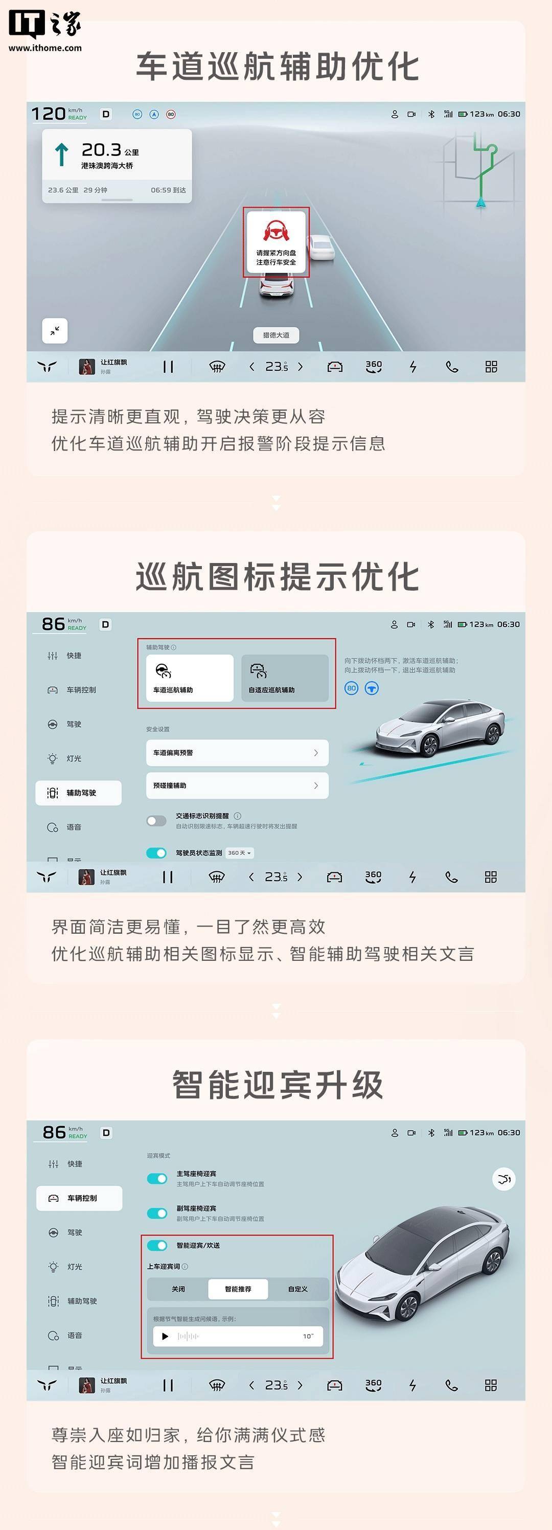 細節(jié)優(yōu)化同樣值得關(guān)注。閉鎖提示音功能為車輛鎖閉時提供清晰反饋;巡航輔助相關(guān)圖標顯示經(jīng)過重新設(shè)計,信息呈現(xiàn)更直觀;智能迎賓詞的播報內(nèi)容也得到豐富。駐車自動下電功能默認狀態(tài)調(diào)整為開啟,減少用戶手動操作步驟。