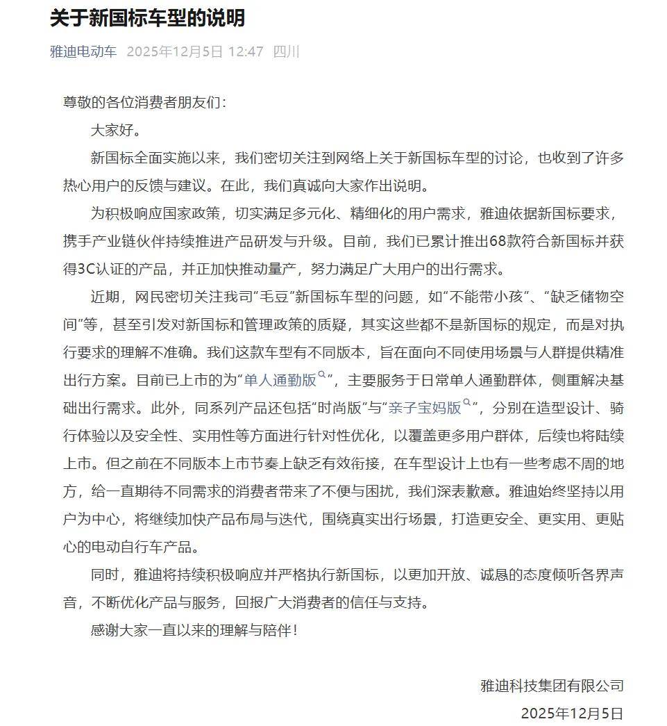 雅迪在聲明中承認,由于不同版本車型的上市節奏銜接不夠緊密,且部分設計細節未充分考慮用戶實際需求,給期待多樣化功能的消費者帶來了困擾,并就此致歉。公司表示,后續將加快其他版本車型的上市進程,同時持續優化產品設計,以更好地滿足市場需求。