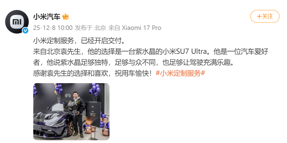 小米汽車近日正式推出定制服務,并宣布首批定制車型已開啟交付。其中,北京的袁先生成為首位提車用戶,他選擇了一臺搭載紫水晶車漆的小米SU7 Ultra。作為資深汽車愛好者,袁先生表示,紫水晶的獨特質感與個性化設計,讓駕駛體驗更具樂趣,也滿足了他對車輛外觀的嚴苛要求。